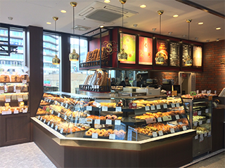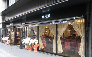 繁華街のホテルの一角に進々堂の新しい顔が誕生。ビルのデザインコンセプトから黒を基調とした外装を取り入れる。